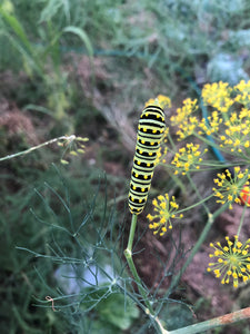 Oruga de cola de golondrina masticando un poco de eneldo en nuestra plantación de polinizadores.